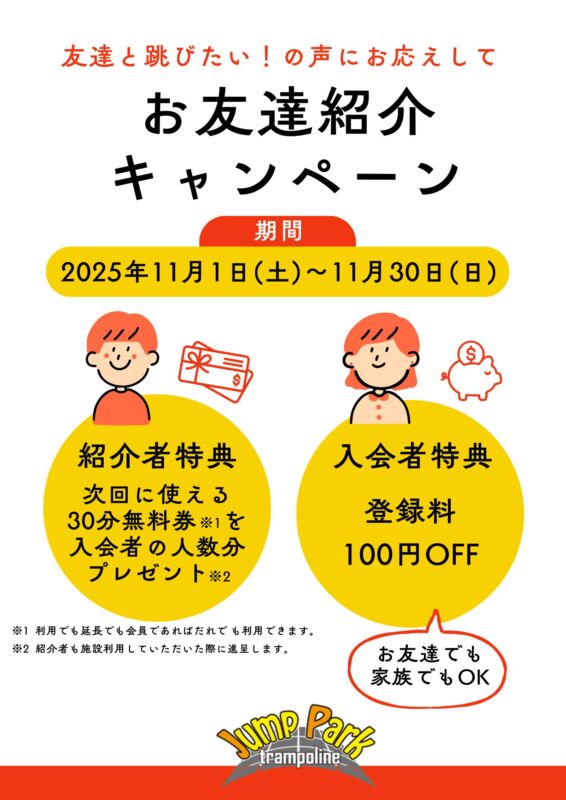 お友達紹介キャンペーン 投稿公開日:2025年10月27日 投稿カテゴリー:お知らせ / News おすすめ 土曜も宿題トランポリン 2023年1月13日 平日限定 大人応援!半額キャンペーン! 2019年6月22日 親子ペアチケット 期間延長! 2021年9月29日