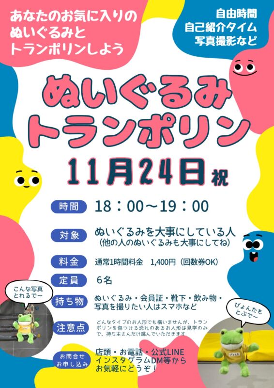ぬいぐるみトランポリン 投稿公開日:2025年11月1日 投稿カテゴリー:未分類 あなたの大事なぬいぐるみと一緒に、トランポリンできたら楽しくないですか?色んなポーズで写真を残したり、他のぬいさん達と交流したり、トランポリンでぬい活しませんか?他のお友達のぬいぐるみも大事に出来る人が参加条件です。大事なお人形なら、「推しのぬいぐるみ」「リカちゃん人形」「ソフビ」など、形態は問いません。但し、トランポリンを傷つける恐れのある形・服装のぬいぐるみは見学でお願いします。 おすすめ NEW 宿題トランポリン 2022年12月2日 トランポリンヨガ 2021年7月31日 忘れ物ないかな? 2020年7月19日