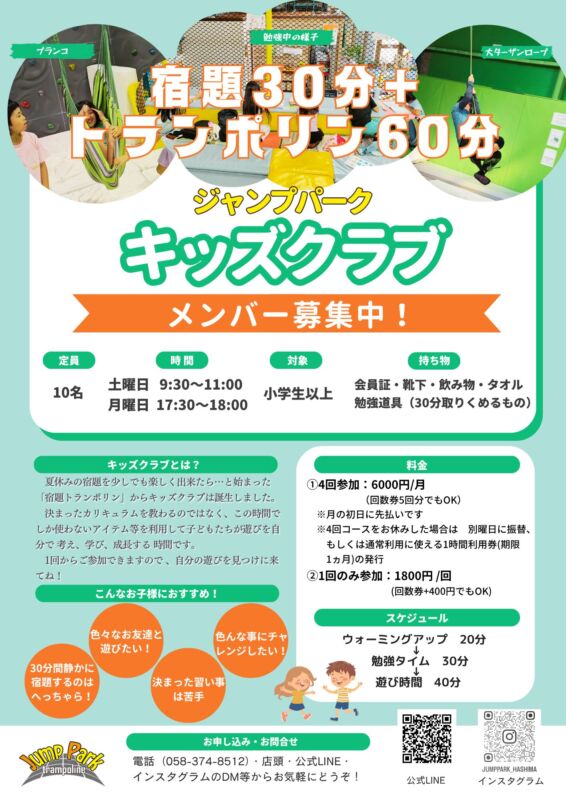 キッズクラブメンバー募集中! 投稿公開日:2026年3月28日 投稿カテゴリー:未分類 宿題30分+トランポリン60分 のクラブです。色々なお友達と遊びたい!色んな遊びにチャレンジしたい!そんなお子様にぴったりです。 ※2026年4月から、土曜日のキッズクラブは運動教室へ変更となります。 月曜日のキッズクラブは変更なしです おすすめ NEW 宿題トランポリン 2022年12月2日 6回チケット発売開始! 2019年7月2日 忘れ物ないかな? 2020年7月19日